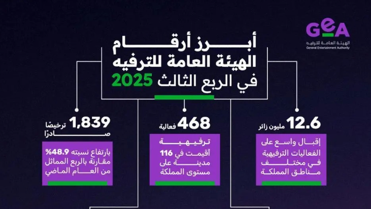 شهد قطاع الترفيه في المملكة خلال الربع الثالث من العام الحالي 2025 نشاطًا متزايدًا وتوسعًا في حجم الفعاليات والتراخيص، وفقًا لتقرير الهيئة العامة للترفيه (GEA)، الذي أظهر تسجيل 12.6 مليون زائر واستمرار النمو في مختلف المؤشرات التنظيمية والرقابية.