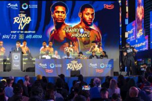 وفي النزال الرئيس المشترك، شهد المؤتمر مواجهة كلامية مثيرة بين الأميركي ديفين هيني والبطل العالمي براين نورمان جونيور، الذي يدافع عن لقب WBO العالمي لوزن الويلتر. وأكد نورمان أنه “قادر على الفوز بأي طريقة”، قائلًا: “إذا أردته بالنقاط سأفعل، وإذا أردته بالضربة القاضية فسأفعل. نحن في حلبة، وليس بإمكانه الركض إلى الأبد”. ورد هيني بهدوء وثقة: “هذه ليست المرة الأولى لي… واجهت أبطالًا كبارًا، ولدينا خطة واضحة. سأستعيد لقب WBO وأعيده لبلدي وفريقي.”.